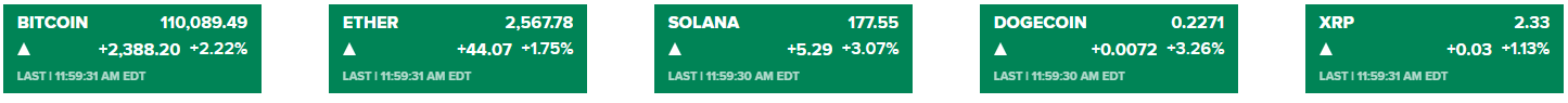 消息后,加密货币多数上涨,比特币一度涨超2%,徘徊11万美元附近。以太币、XRP一度涨超1%,Solana、狗狗币一度涨超3%。